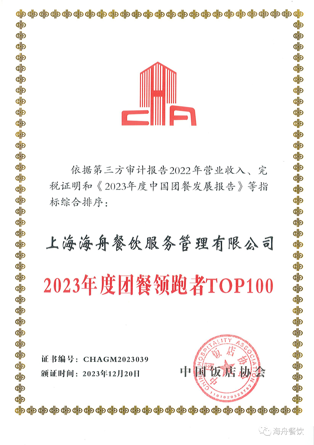 我司獲評(píng)“2023年度團(tuán)餐領(lǐng)跑者TOP100” | 動(dòng)態(tài)新聞 | 行業(yè)洞見 | 上海海舟餐飲服務(wù)管理有限公司